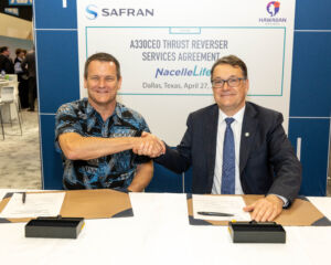 During this week’s MRO Americas event in Dallas, Safran Nacelles signed a six-year contract renewal with Hawaiian Airlines to service the thrust reversers on the carrier’s 24 Airbus A330ceo aircraft.